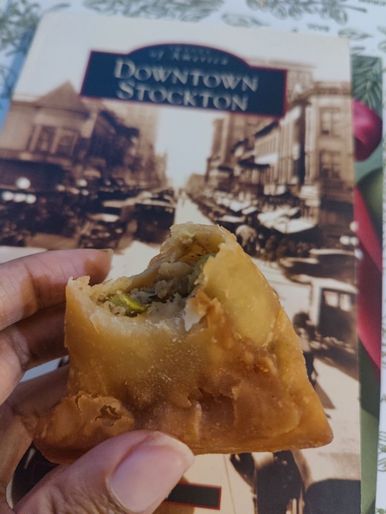This samosa consists of green peas and potatoes. Samosas are essentially a pastry with sweet or savory fillings.