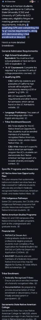 One can look at the admissions requirements of Native American students to California State University.The website ishttps://www.aihec.org/tribal-colleges-universities/