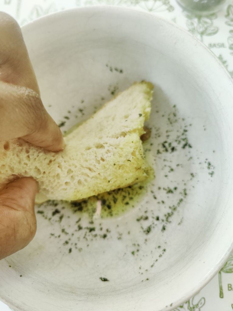 Organic cilantro leaf AND organic olive oil on sourdough bread.